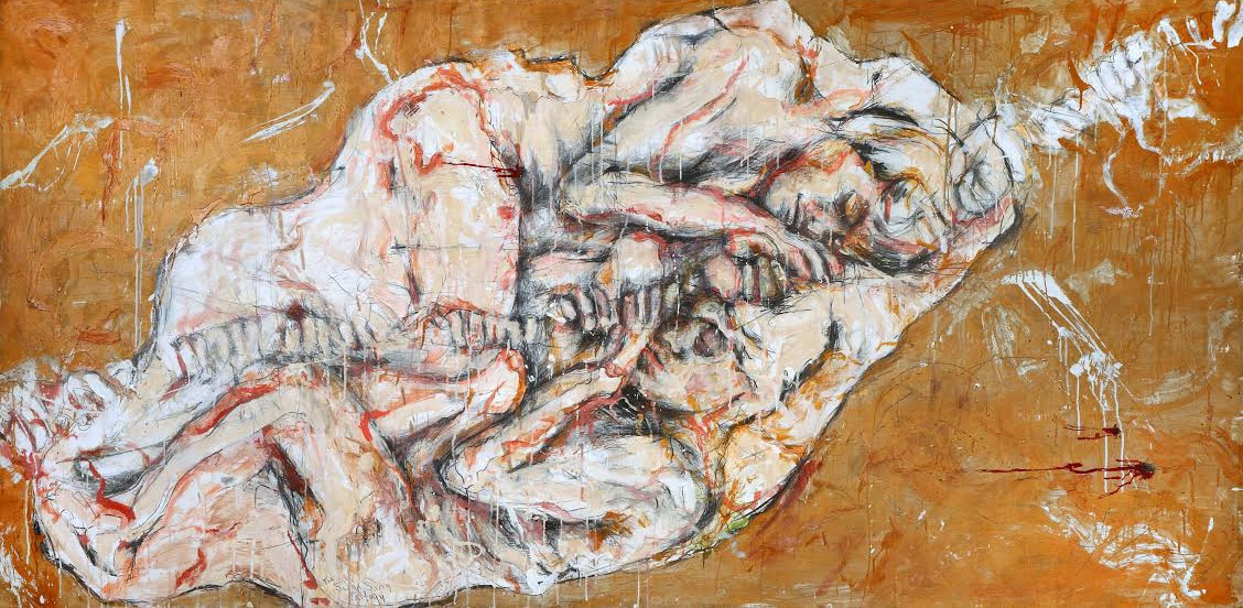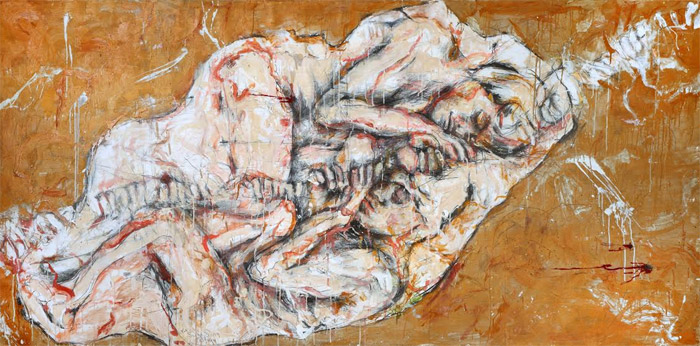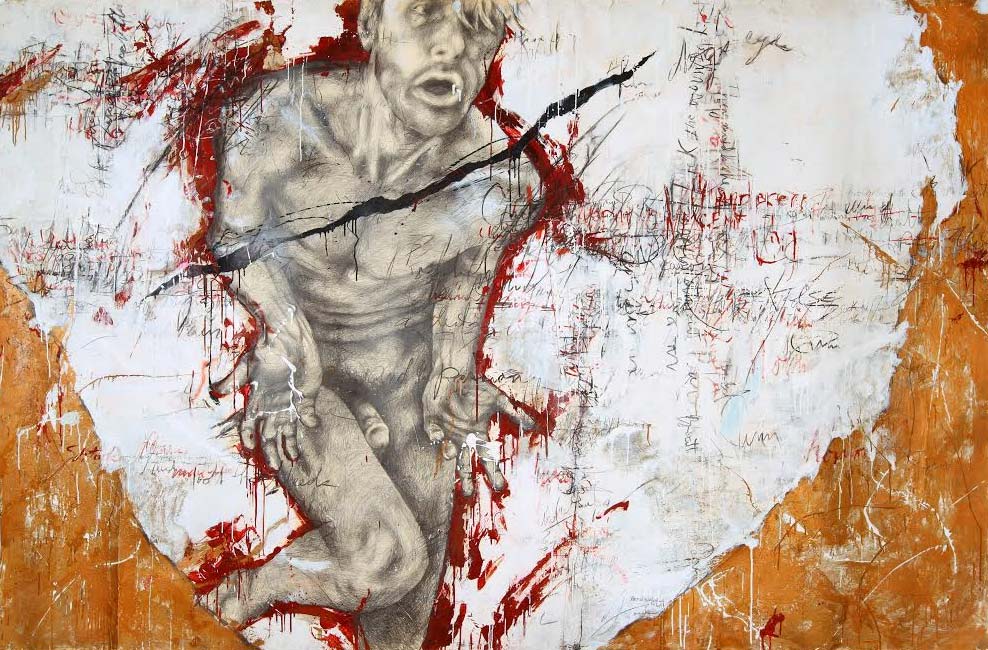 Surrender of an erotic nature seems to be a solution for this naked solitary soldier. Eyes that peer out in disbelief accompany a form that prances forth from a blood-red silhouette.