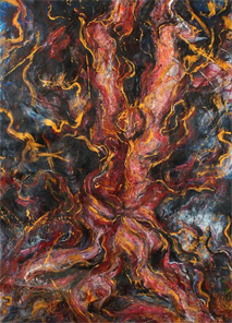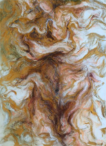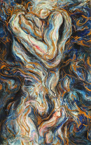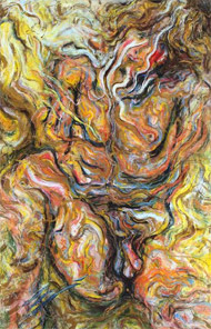 A facial expression that is somewhat forlorn is projected amidst sparks that fly off the figurative form only to congregate into the total atmosphere that feeds back to the pose and into the flesh from whence it was concieved.