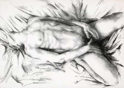 Academic studio poses are often the beginning bases of further figurative exploration as well. They can then transcend into a state of cohesion addressing nudification in the pioneering of the unexplored, with manipulation by the artist and his dexterity and the uncontained passion, but spirited generosity, of the model... thus a presentation of flourishing works of art that bolster from a launching pad into tumultuous eruptions... are delivered from the etude. Under these auspicious declarations the formula for a completed life drawing of the naked figure is at the hands of internal inspiration, external exploration and deitization of creativity.